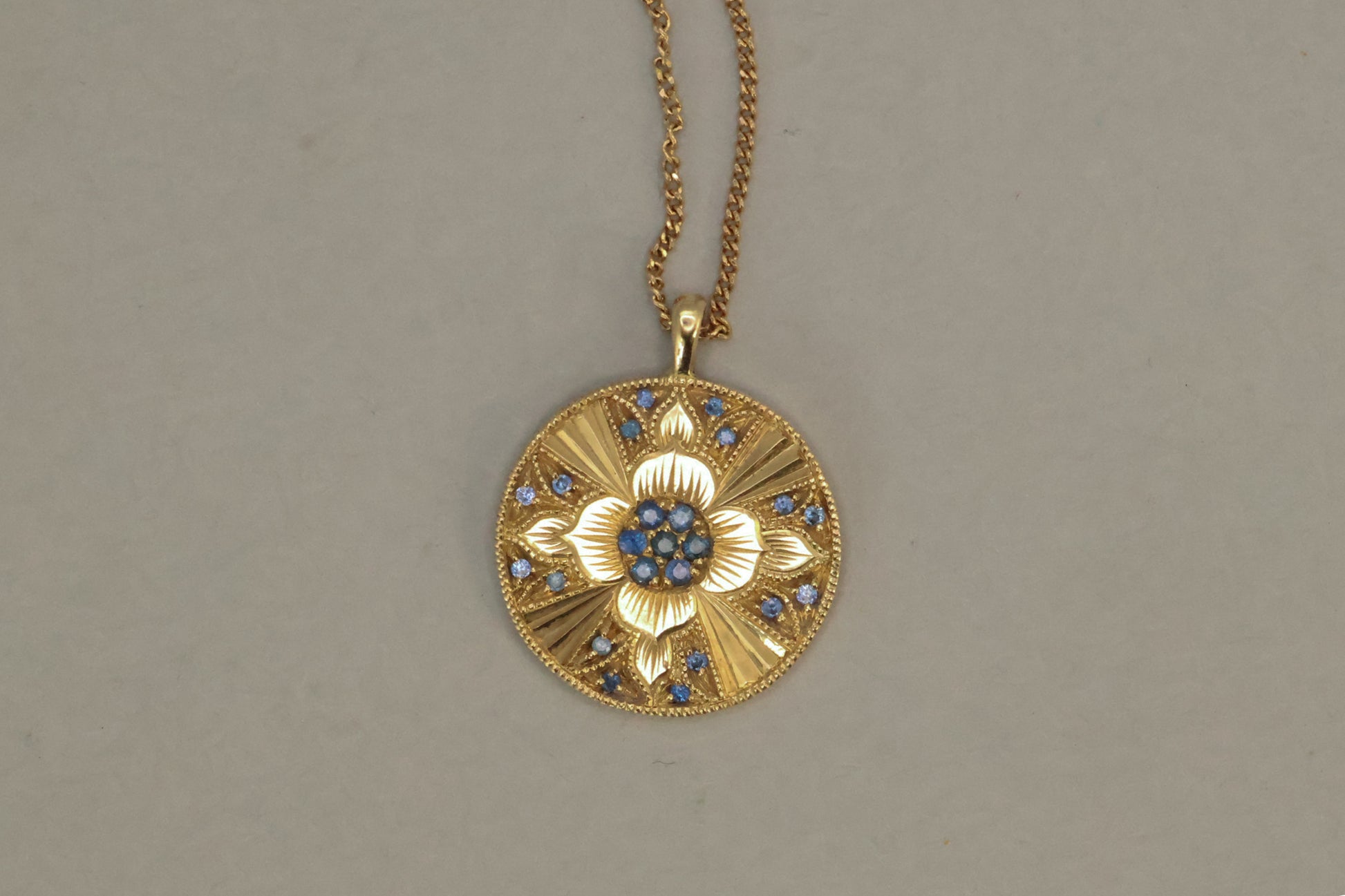 A ornamental hand engraved medallion in 14K gold and blue sapphires.
