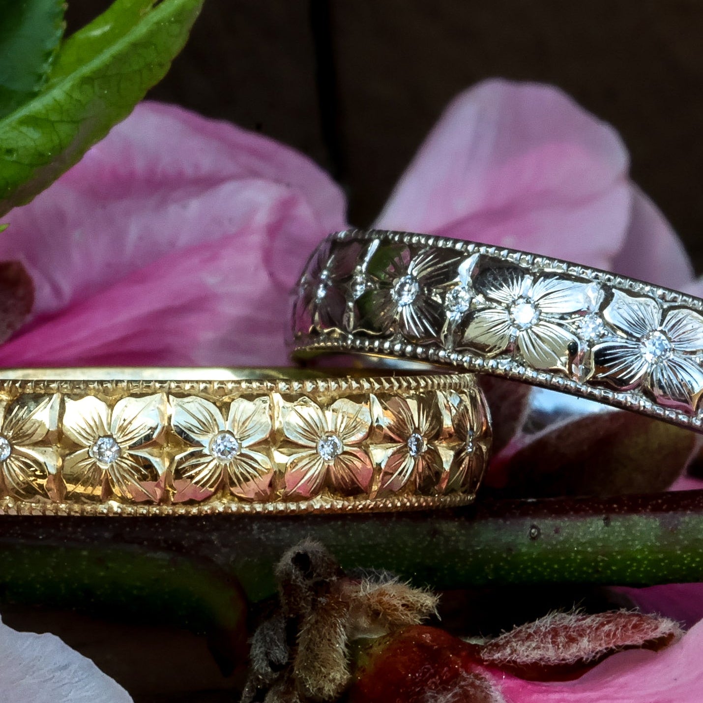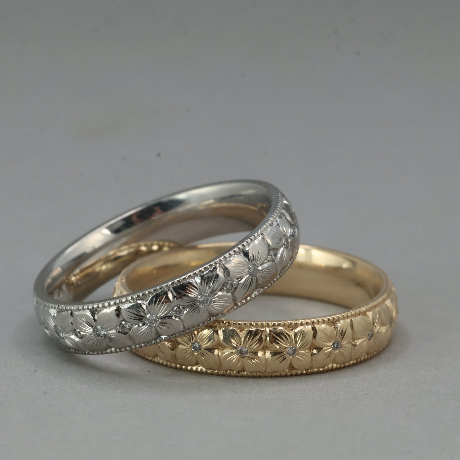 The Dahlia Band is a hand engraved and sculpted bright cut flower pattern with delicate milgrain detailing. 1mm natural diamonds embellish the center of each flower. This ring is a rounded 4mm band that is comfort fit for maximum wearability.