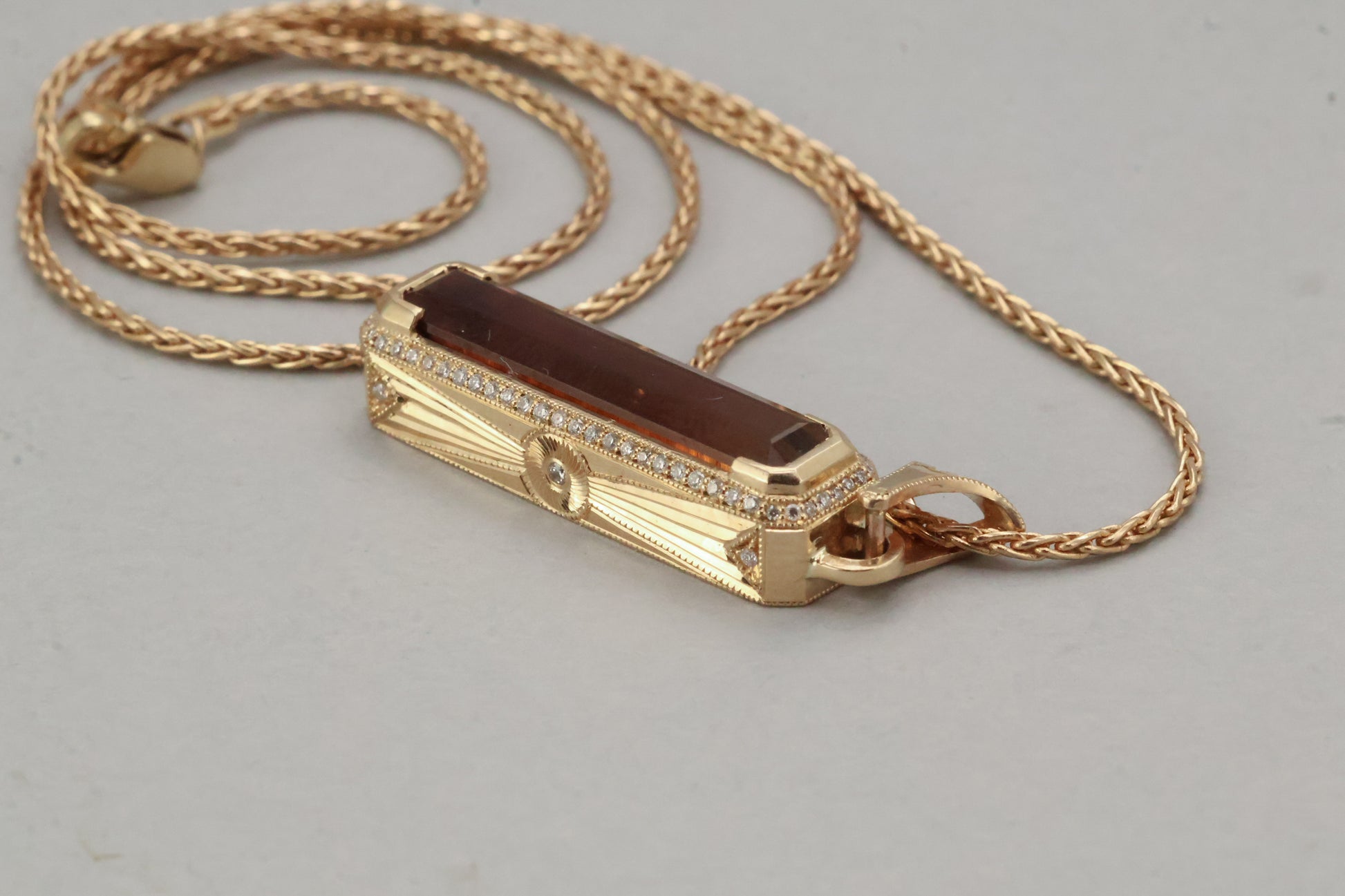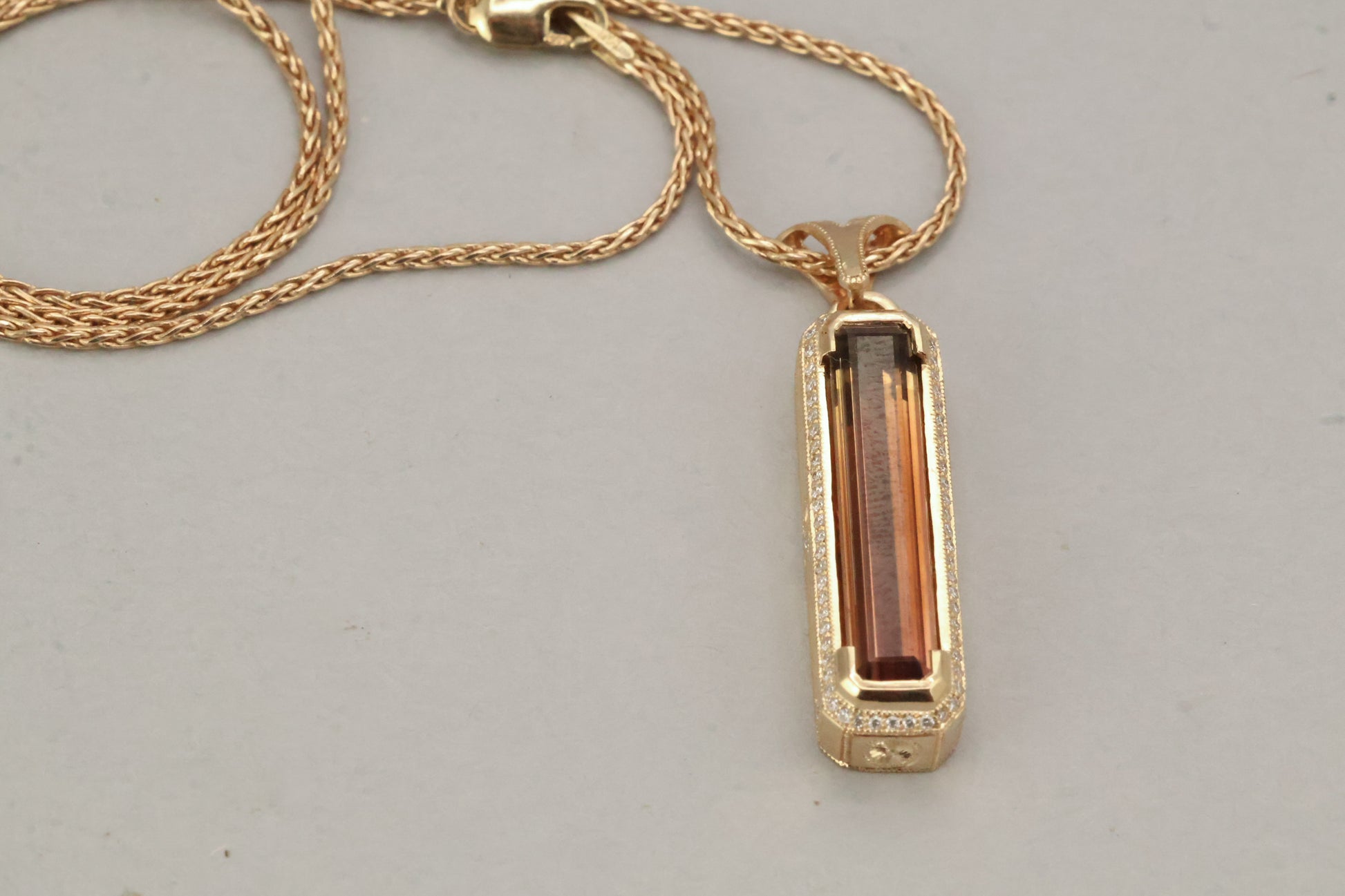 This hand fabricated pendant features a one of a kind Congo Tourmaline, a white diamond halo, and delicate hand engraved details.