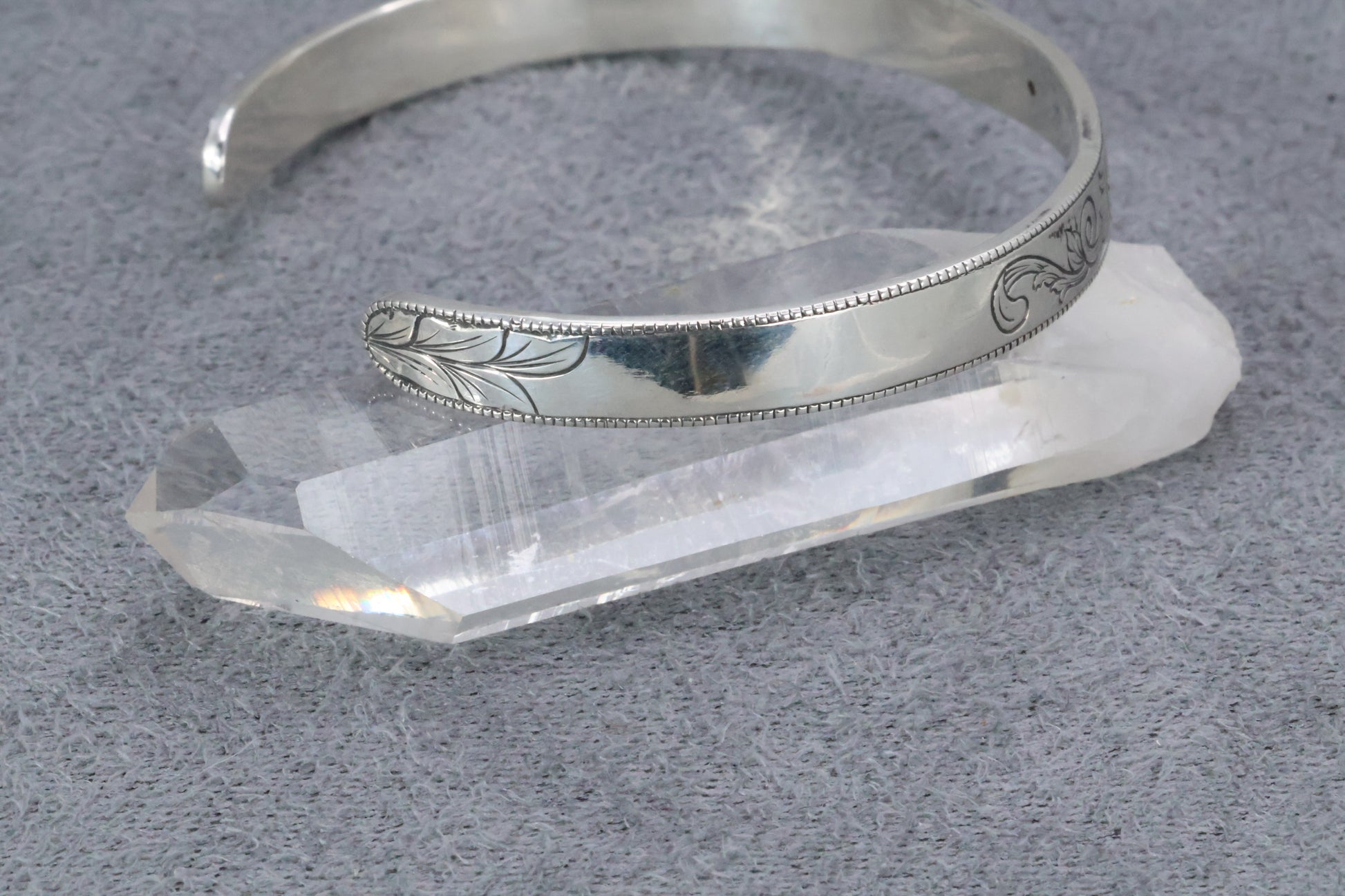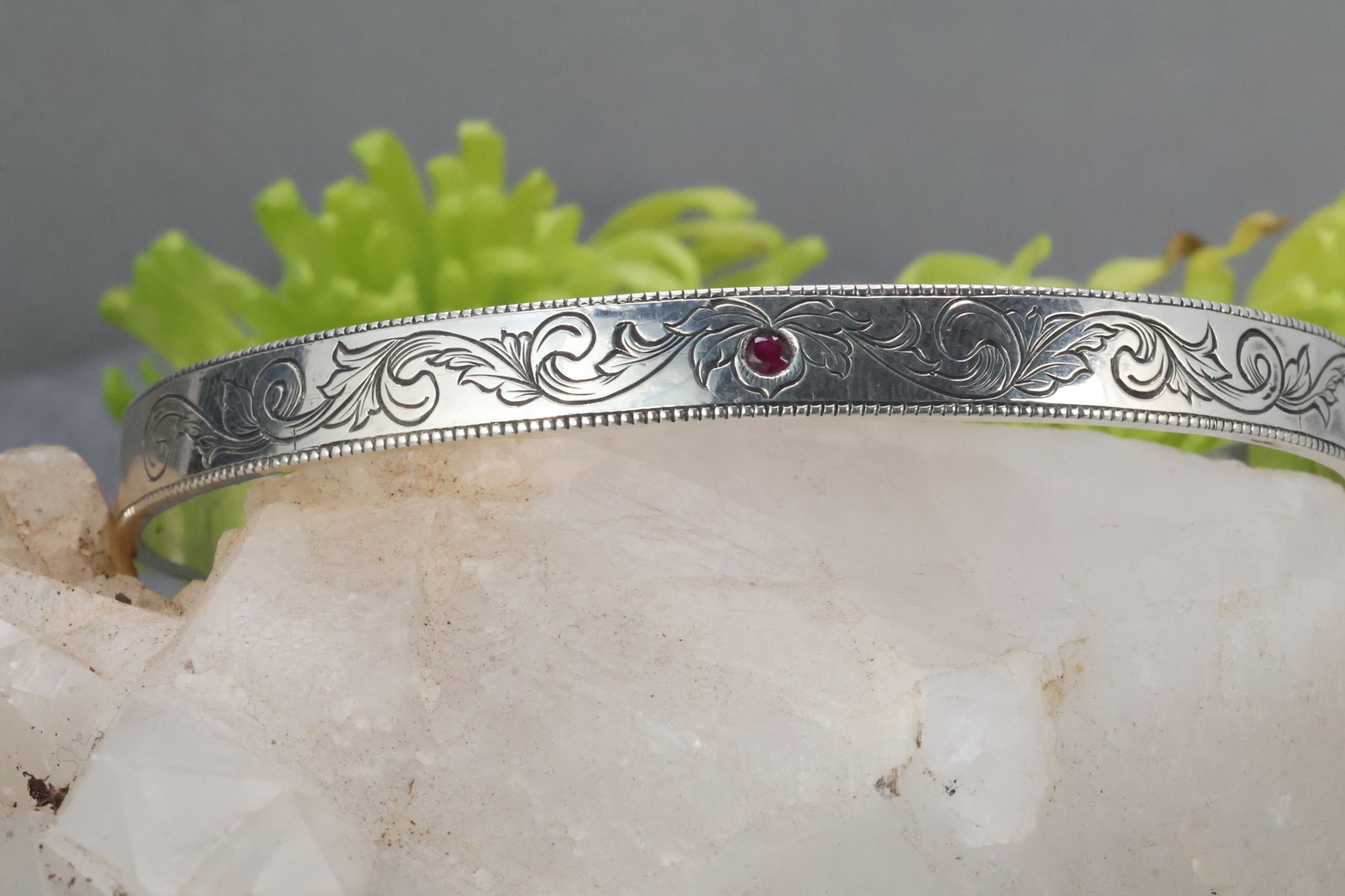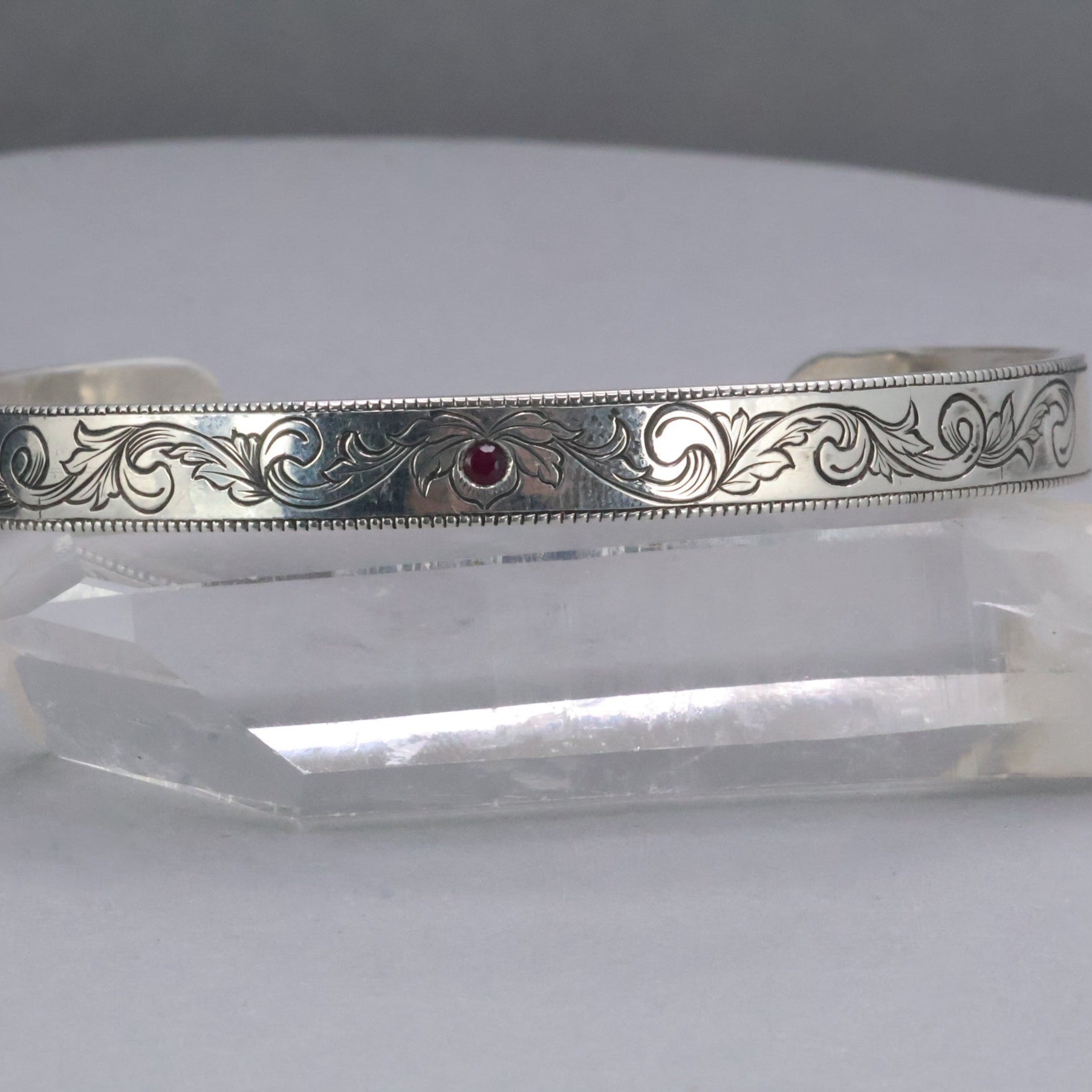 Sterling Silver Hand Engraved Scroll Cuff featuring a 2mm Ruby in the center.