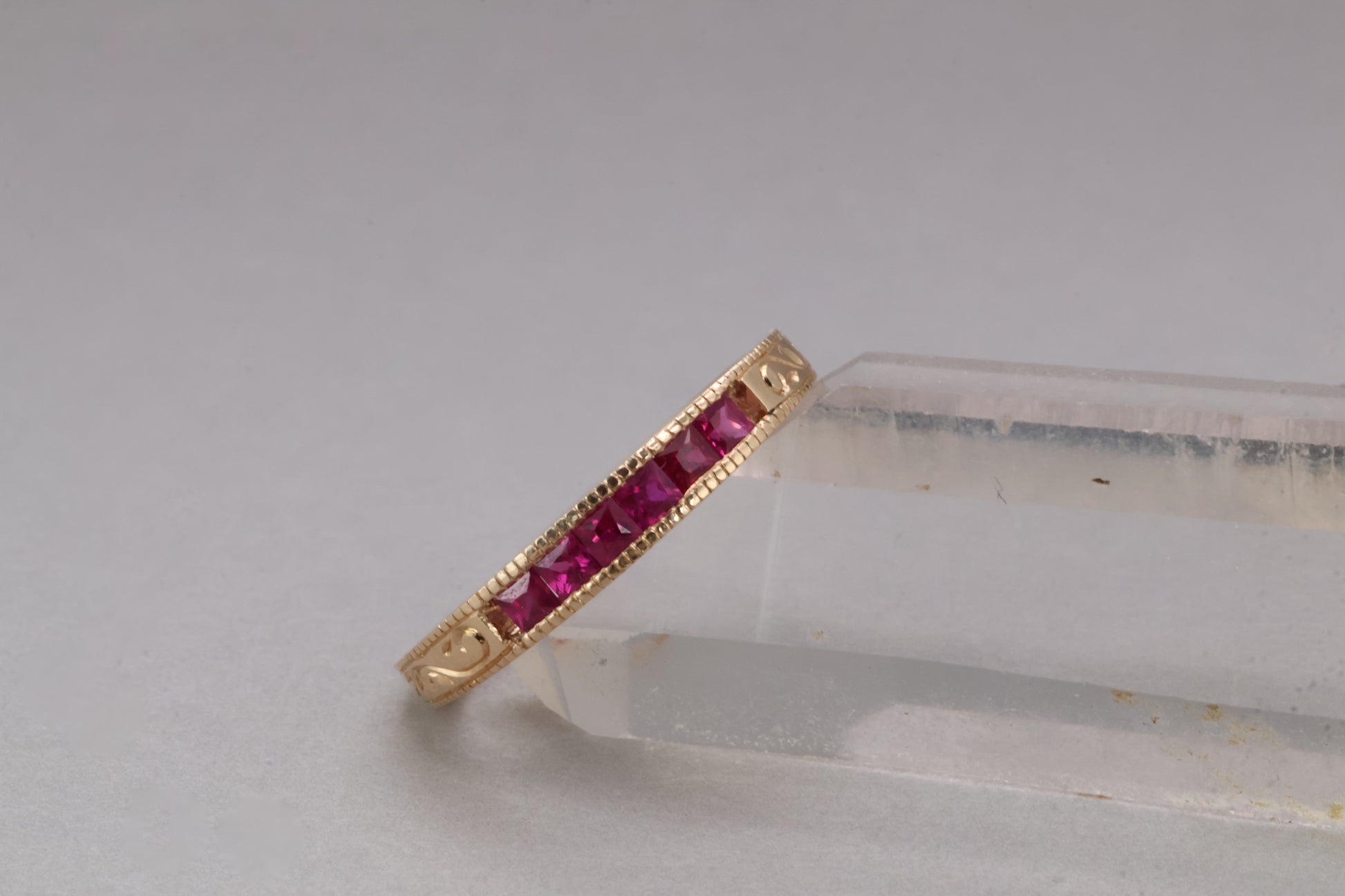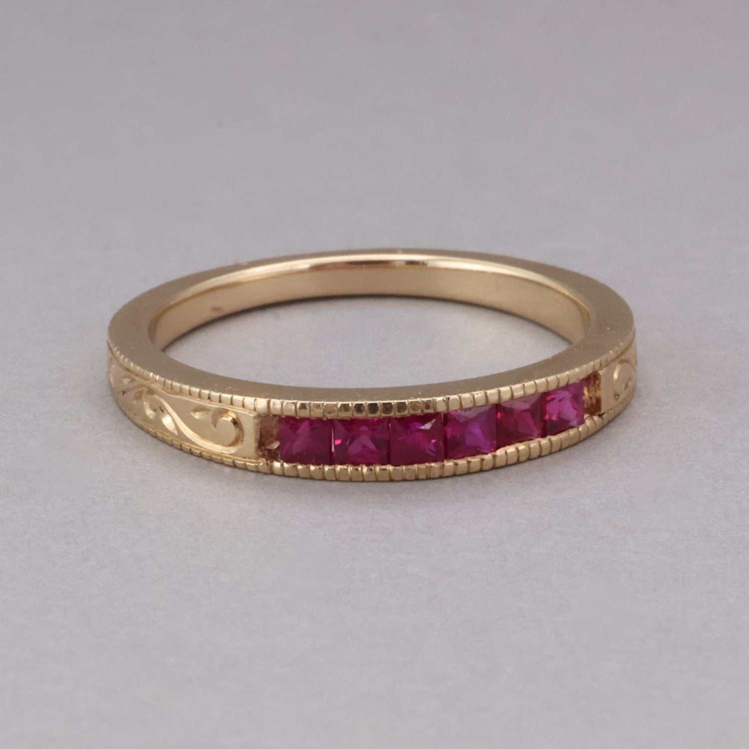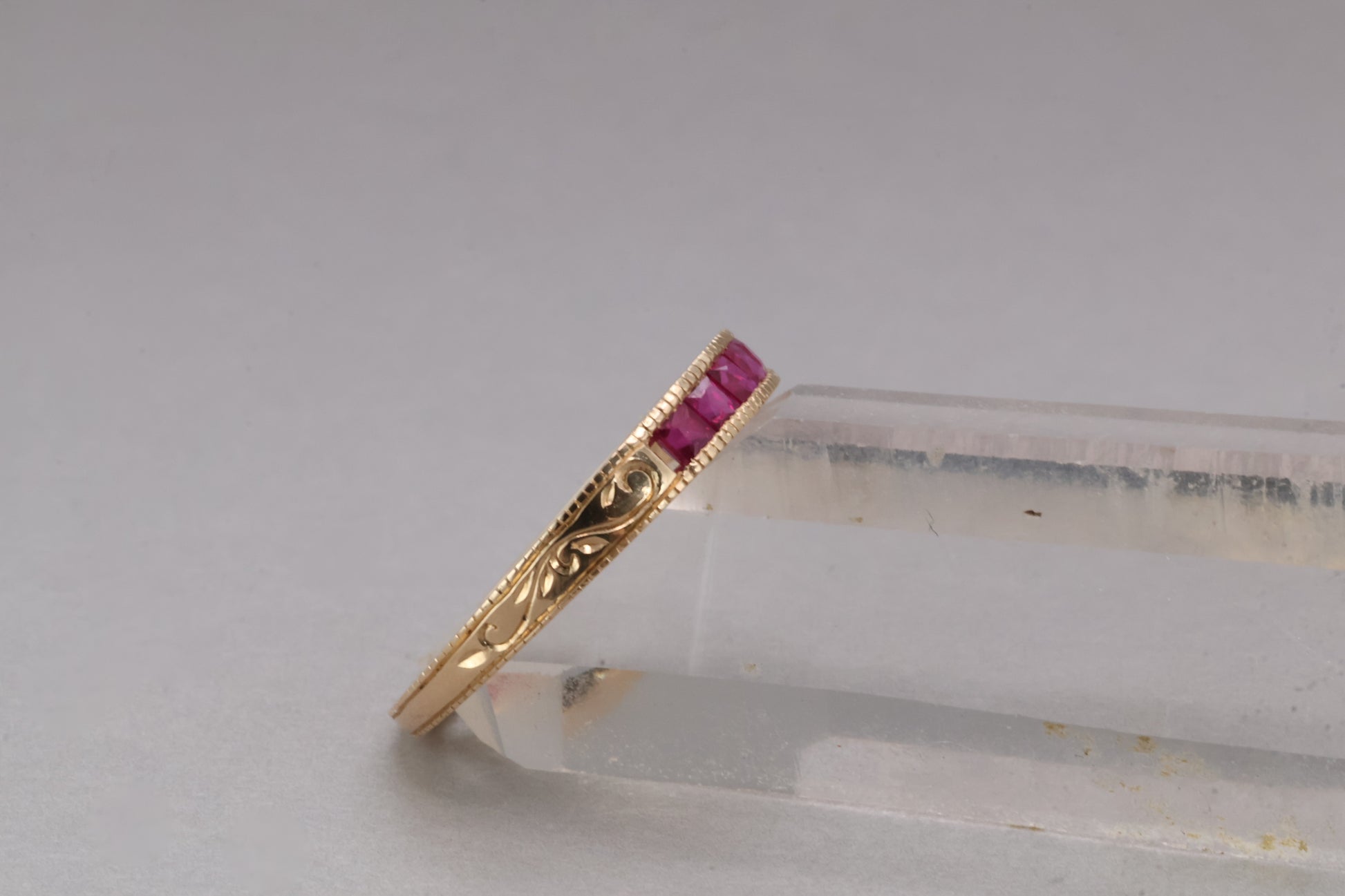 14K Yellow Gold and Ruby Princess Channel Band. This band has millgrain detailing, a tapered band, and a hand engraved leafy scroll on the band.