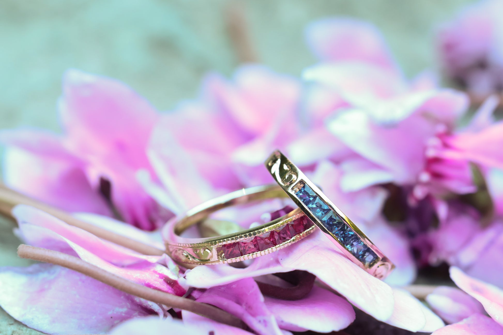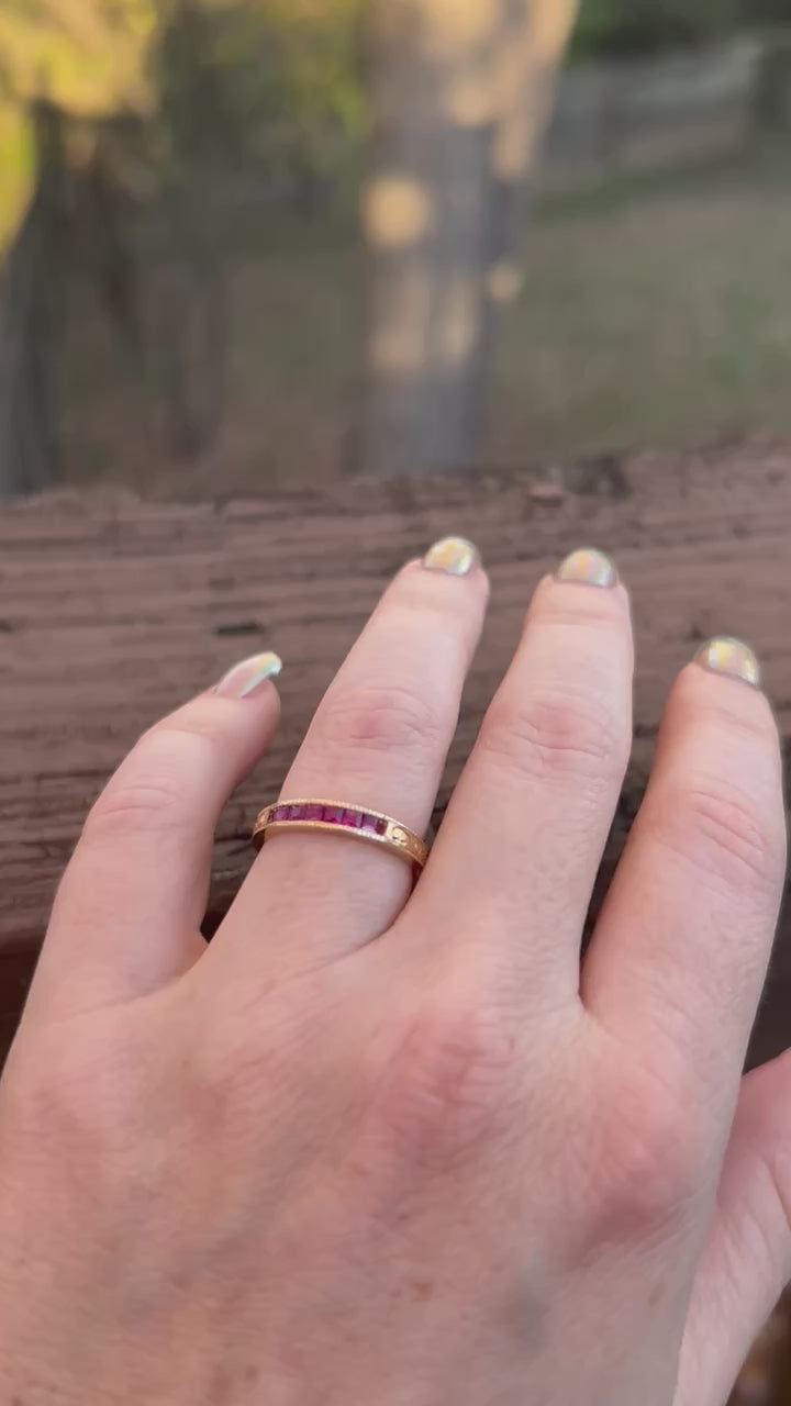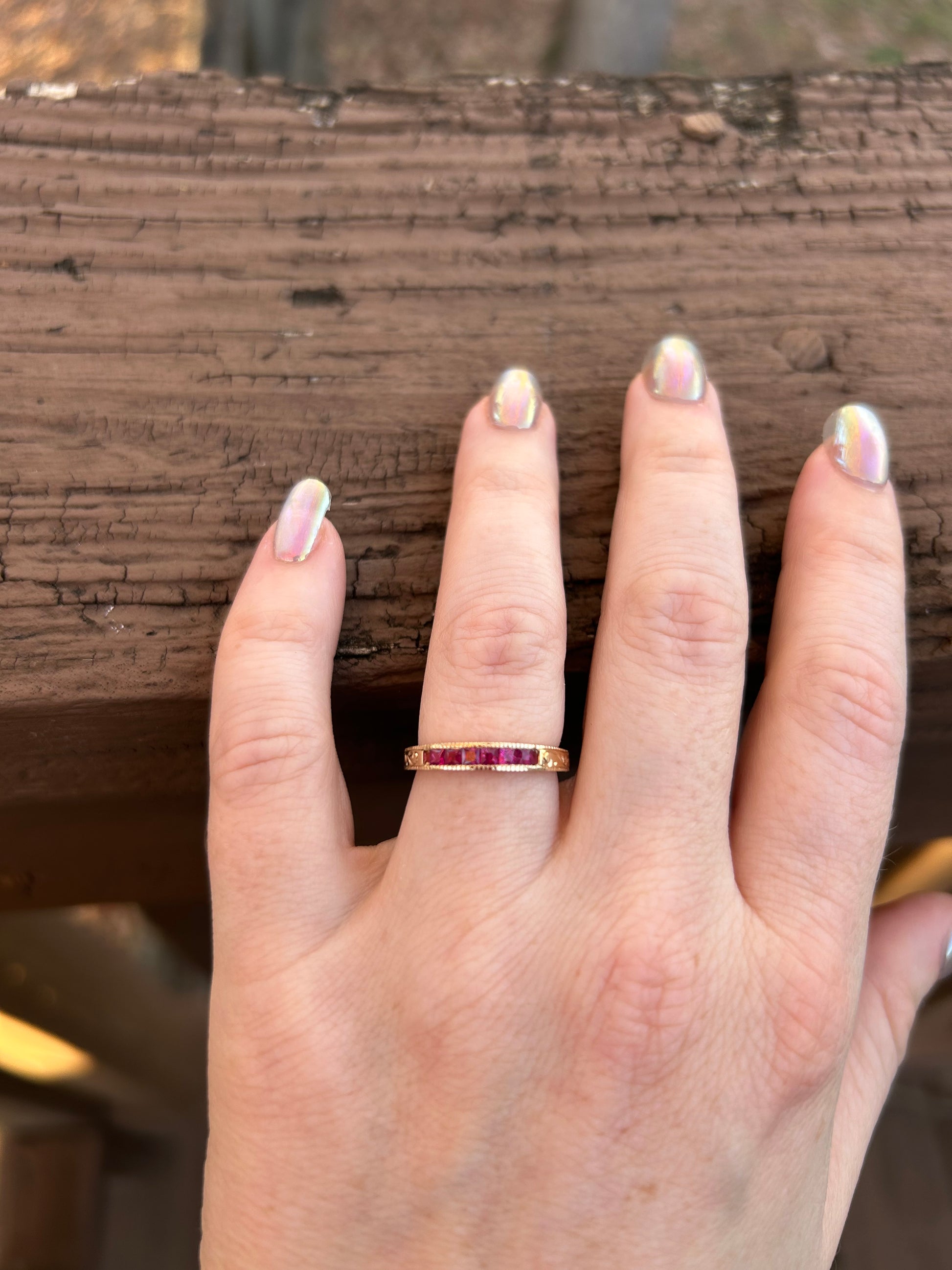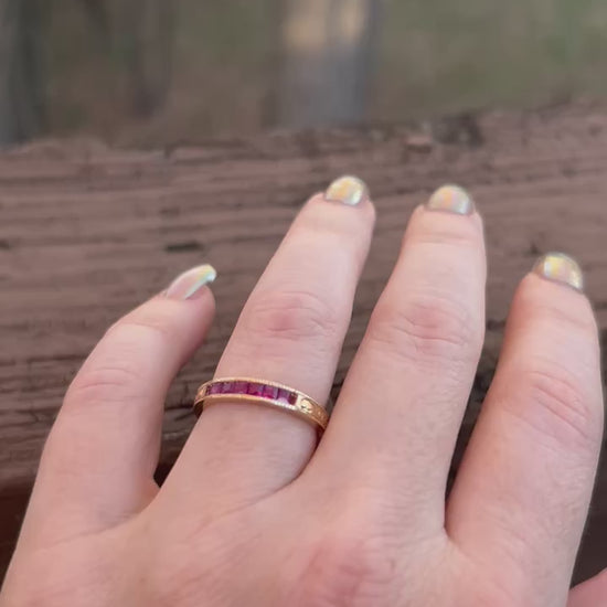 14K Yellow Gold and Ruby Princess Channel Band. This band has millgrain detailing, a tapered band, and a hand engraved leafy scroll on the band.