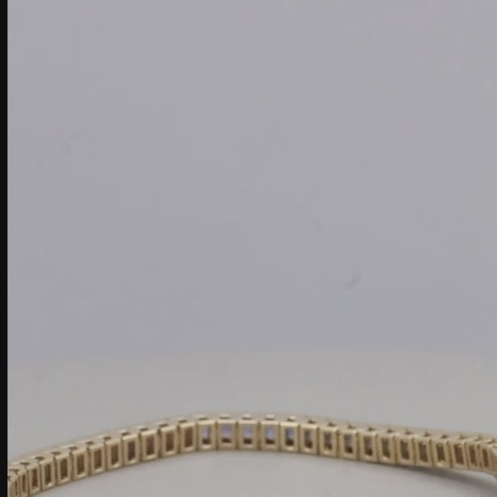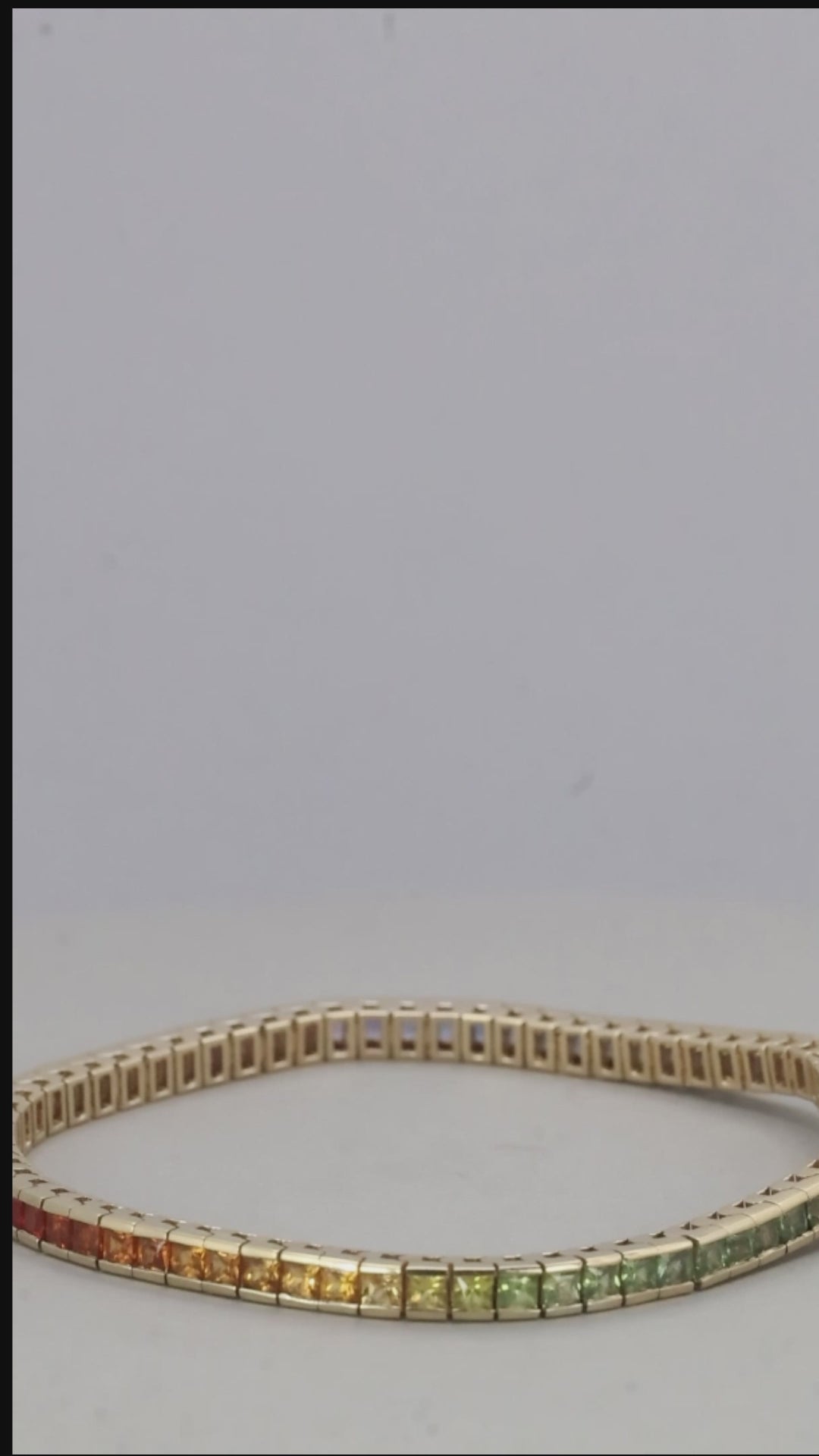 Sleek, 14K yellow gold channel set tennis bracelet in a gradient of rainbow princess cut sapphires.