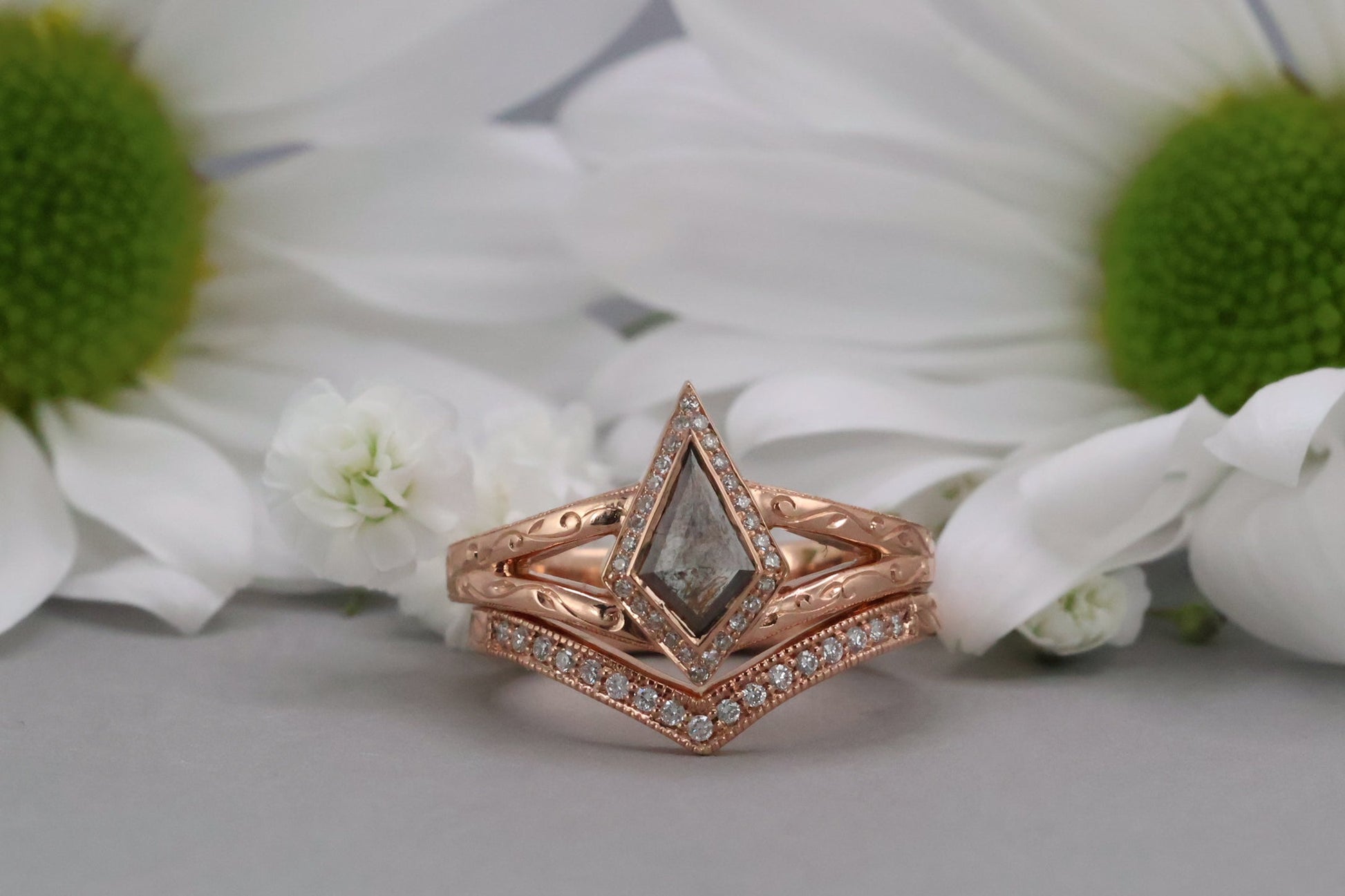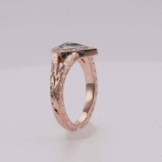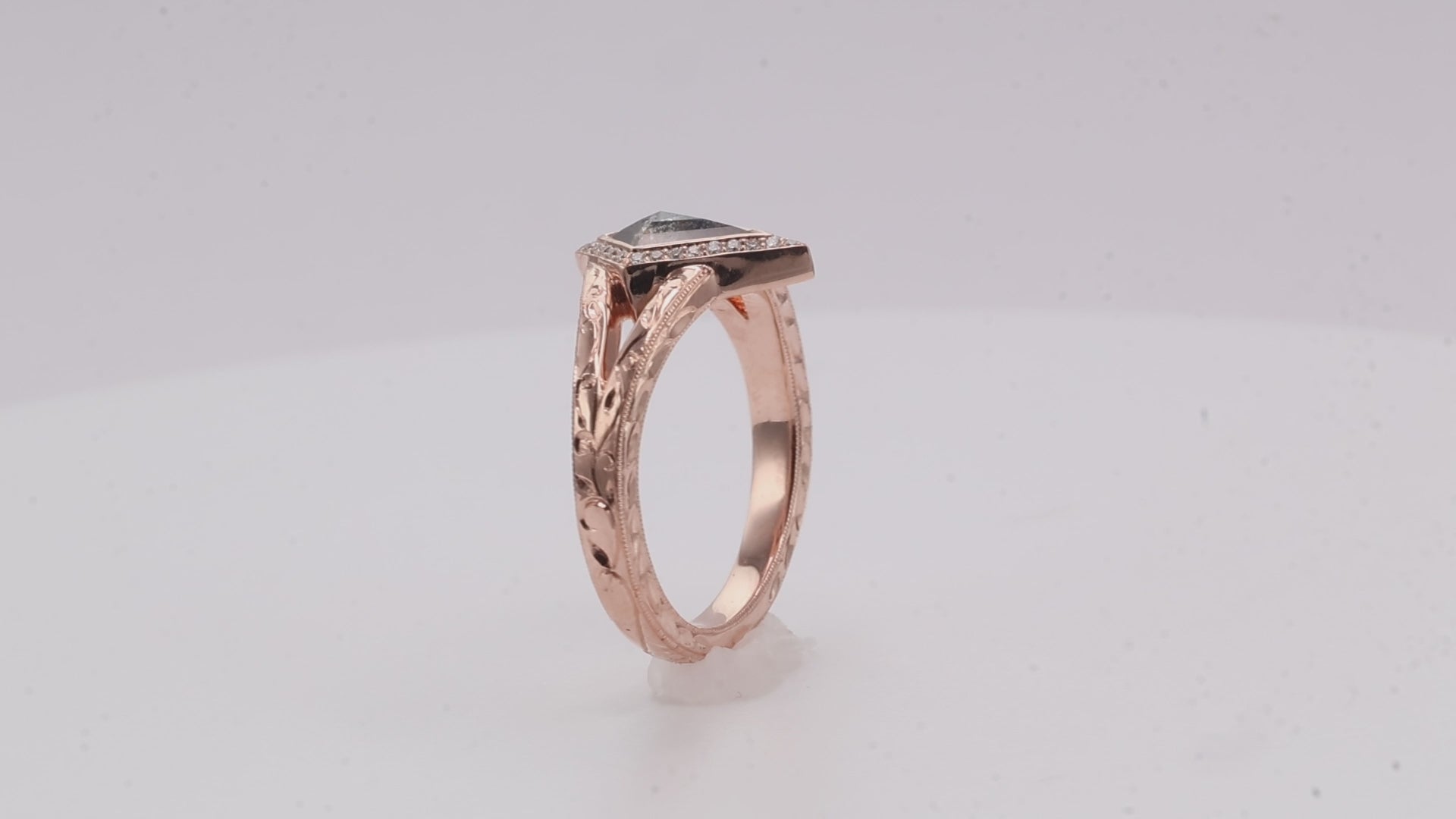 Verdant Ring features a stunning, flush-set salt and pepper Kite Diamond (.67ct.), framed by a white diamond pavé halo (28, .8mm diamonds). The bright-cut hand engraving adds a special touch with the leaf detailing on profiles and vine on the split shank band.